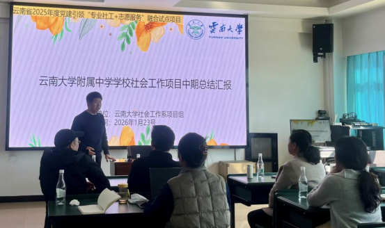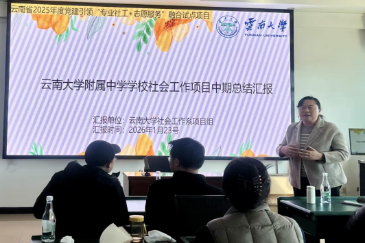 2026年1月23日,由云南大学民族学与社会学学院社工系承接的省委社工部2025年度党建引领“专业社工+志愿服务”融合试点项目:“家校社协同促进中学生心理健康项目”中期总结会在云南大学附属中学教学楼5楼教室举行。此次会议旨在展示2025年10月以来的驻校社工中期服务成果,并与校方共同谋划下一步深化协作、拓展和深化学校心理健康服务服务的路径。云南大学民族学与社会学学院社会工作系主任高万红教授、副系主任王硕副教授、汪榕博士,云大附中副校长杨树保、德育处主任钱子雄、初三年级组组长张炜玮、心理教研组组长张德权、团委书记许小蕾、第四党支部书记葛毅、班主任代表杨起涛及项目团团队成员(社工专业硕士和专业博士组成)参加了本次中期汇报会。